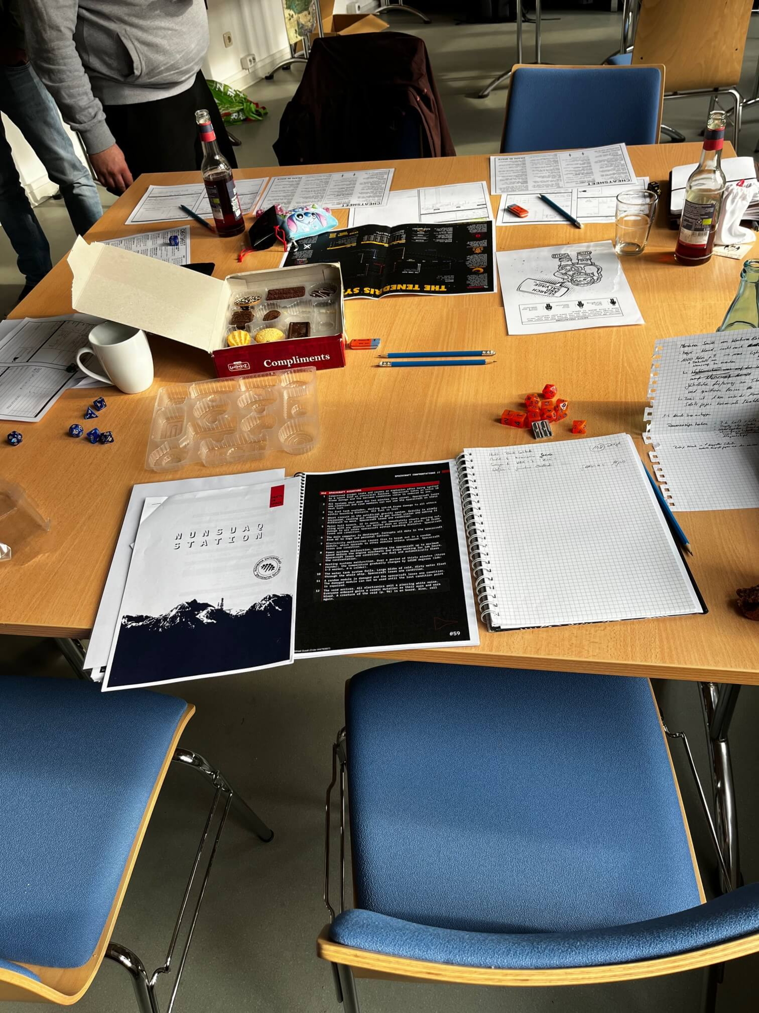 Insgesamt hatten wir fünf Spielrunden, zwei am Vormittag, drei am Nachmittag. Davon ist nachmittags eine spontan entstanden, weil jemand gesagt hat: "Ja, ich hab auch meine DSA-Sachen mit. Ich kann einfach auch DSA leiten." Und dann haben die Leute das auch wahrgenommen.